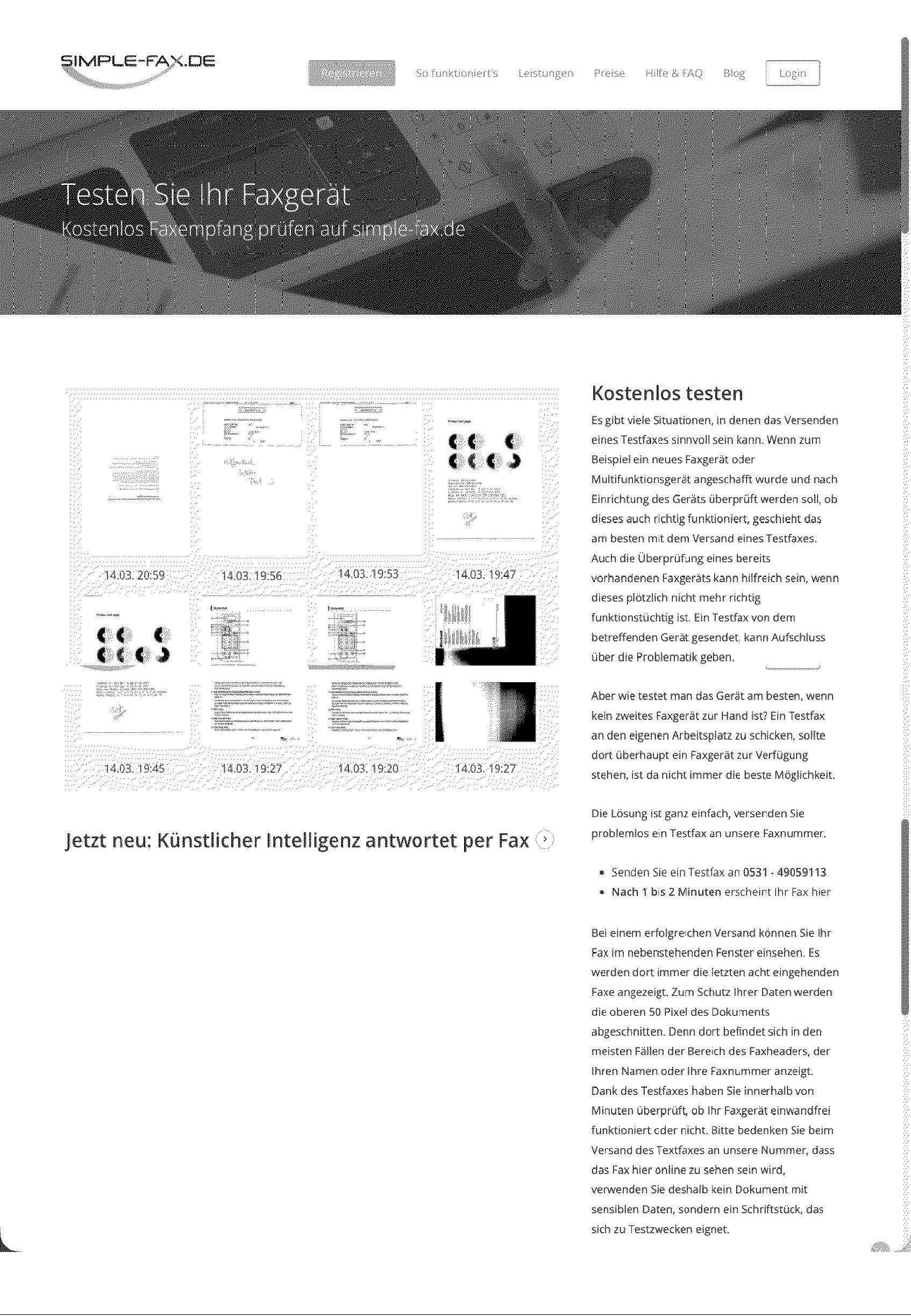 Bei einem erfolgreichen Versand können Sie Ihr Fax im nebenstehenden Fenster einsehen. Es werden dort immer die letzten acht eingehenden Faxe angezeigt. Zum Schutz Ihrer Daten werden die oberen 50 Pixel des Dokuments abgeschnitten. Denn dort befindet sich in den meisten Fällen der Bereich des Faxheaders, der Ihren Namen oder Ihre Faxnummer anzeigt. Dank des Testfaxes haben Sie innerhalb von Minuten überprüft, ob Ihr Faxgerät einwandfrei funktioniert oder nicht. Bitte bedenken Sie beim Versand des Textfaxes an unsere Nummer, dass das Fax hier online zu sehen sein wird, verwenden Sie deshalb kein Dokument mit sensiblen Daten, sondern ein Schriftstück, das sich zu Testzwecken eignet.