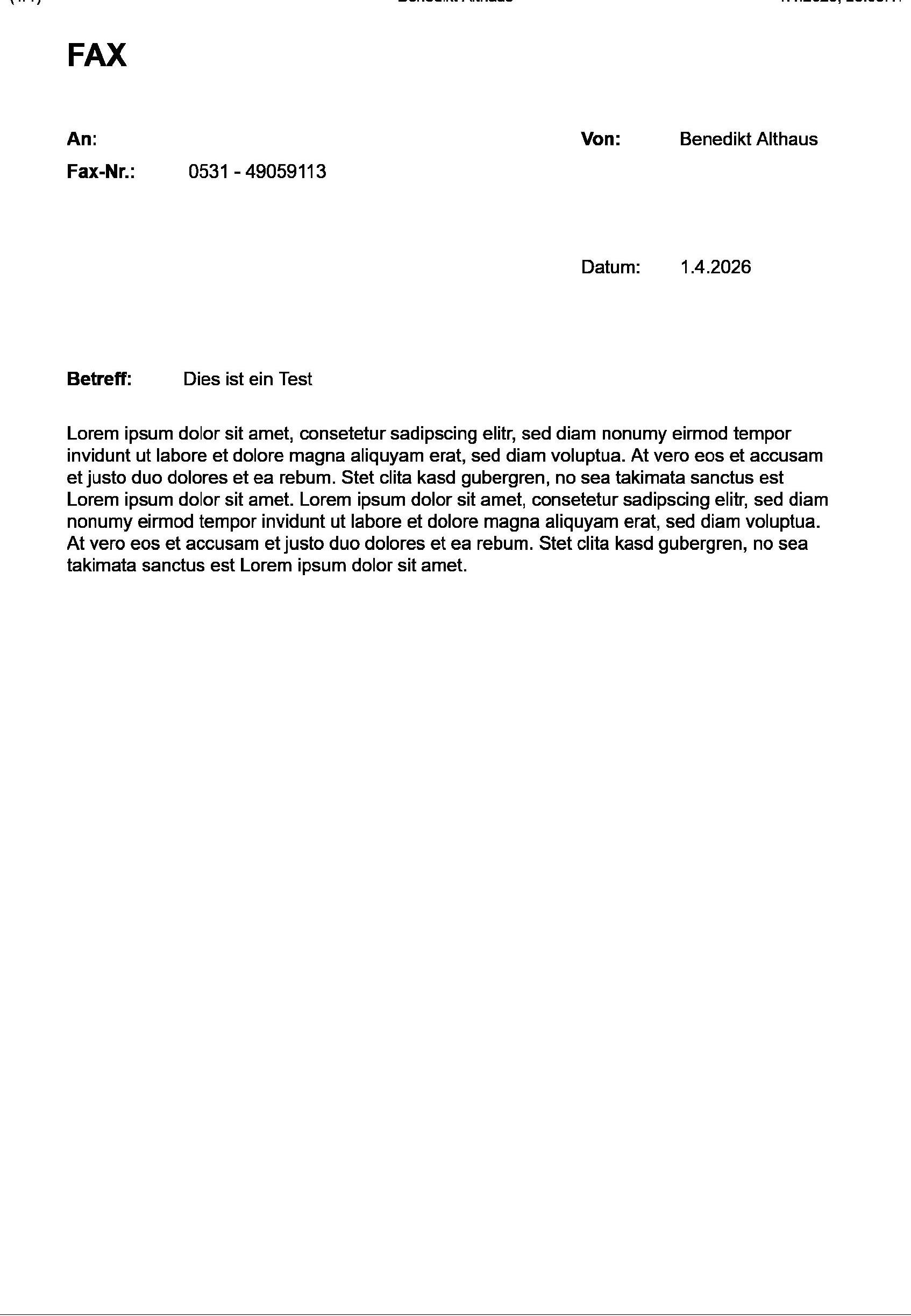 Bei einem erfolgreichen Versand können Sie Ihr Fax im nebenstehenden Fenster einsehen. Es werden dort immer die letzten acht eingehenden Faxe angezeigt. Zum Schutz Ihrer Daten werden die oberen 50 Pixel des Dokuments abgeschnitten. Denn dort befindet sich in den meisten Fällen der Bereich des Faxheaders, der Ihren Namen oder Ihre Faxnummer anzeigt. Dank des Testfaxes haben Sie innerhalb von Minuten überprüft, ob Ihr Faxgerät einwandfrei funktioniert oder nicht. Bitte bedenken Sie beim Versand des Textfaxes an unsere Nummer, dass das Fax hier online zu sehen sein wird, verwenden Sie deshalb kein Dokument mit sensiblen Daten, sondern ein Schriftstück, das sich zu Testzwecken eignet.