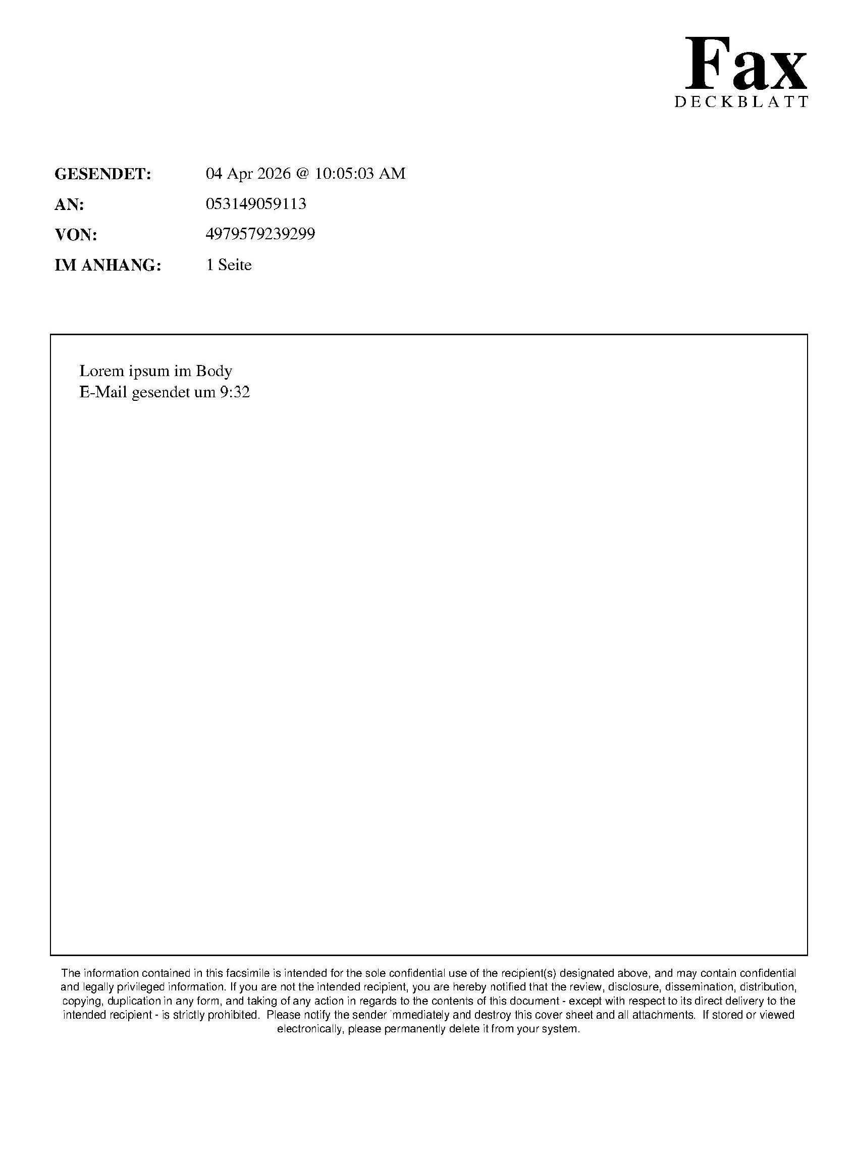Dieser Service ist für Sie kostenlos, eine Anmeldung oder Registrierung ist dafür nicht notwendig. Wenn Sie ein Fax an einen anderen Adressaten senden möchten, testen Sie hierfür unseren Testfaxversand, ein ebenfalls kostenloser Service von simple-fax.de, mit dem Sie zwei Testfaxe ohne weiteren Kosten versenden können.